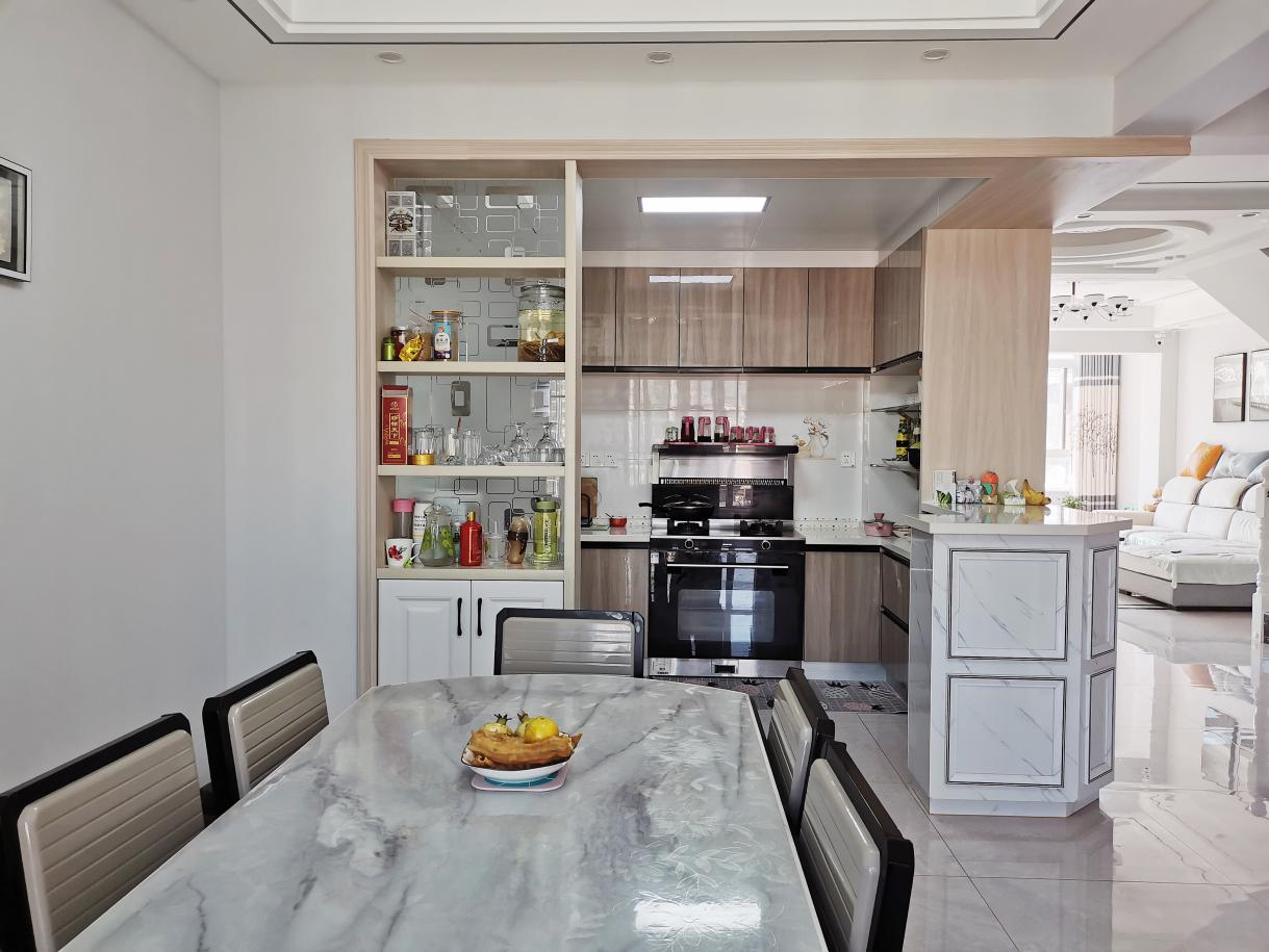 繁而不亂,這應該就是方女士的居家藝術吧,半開發式的廚房里,能清晰的觀賞愛人在灶臺前忙碌的身影,也是工作之余一道溫暖又獨特的風景。明亮寬敞的空間,干脆簡練的風格,完美詮釋了東方女人賢惠,得體之美。北斗星集成灶被安置在最顯眼的位置,也在暗暗顯現著女主的生活智慧,低調中暗含著高貴。