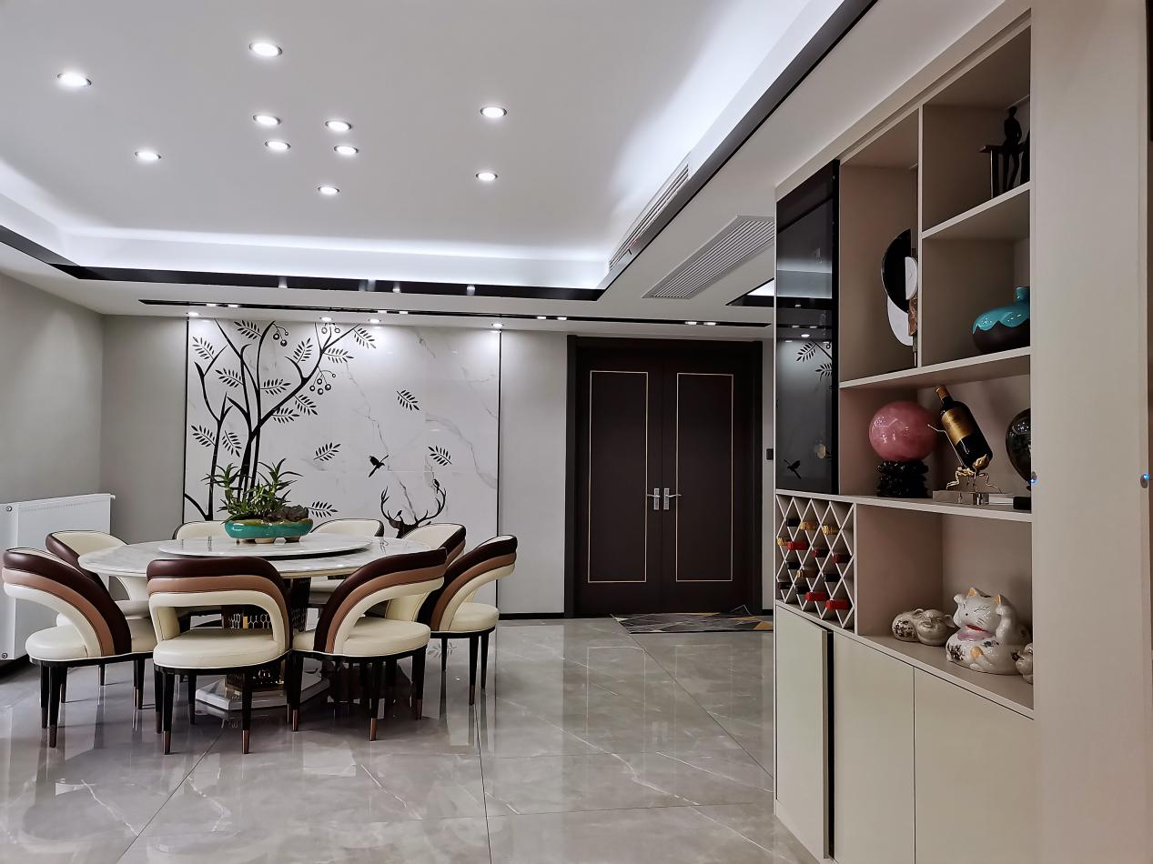 休閑區的墻面做了一個“一鹿有你”的背景墻,為了不會顯得地面飄,我適當的選擇了深色的圓桌壓低視線,而且預留了一個吧臺的位置,連著酒柜置物臺,放酒水、擺件兩不誤,沒事還可以坐在這小酌一杯!